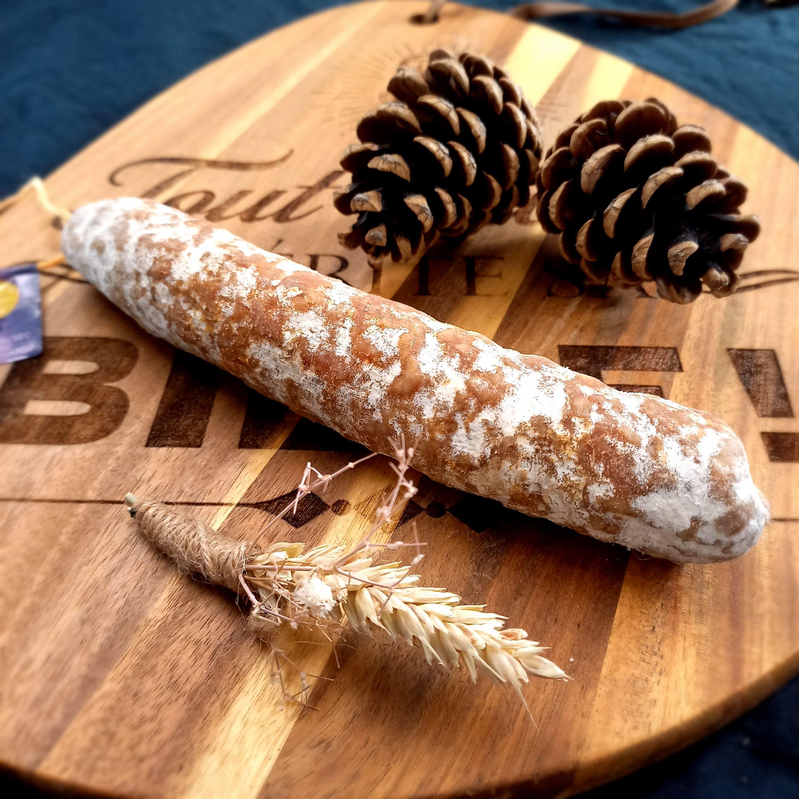Un saucisson traditionnel, typique de l’Auvergne, préparé selon un savoir-faire artisanal.