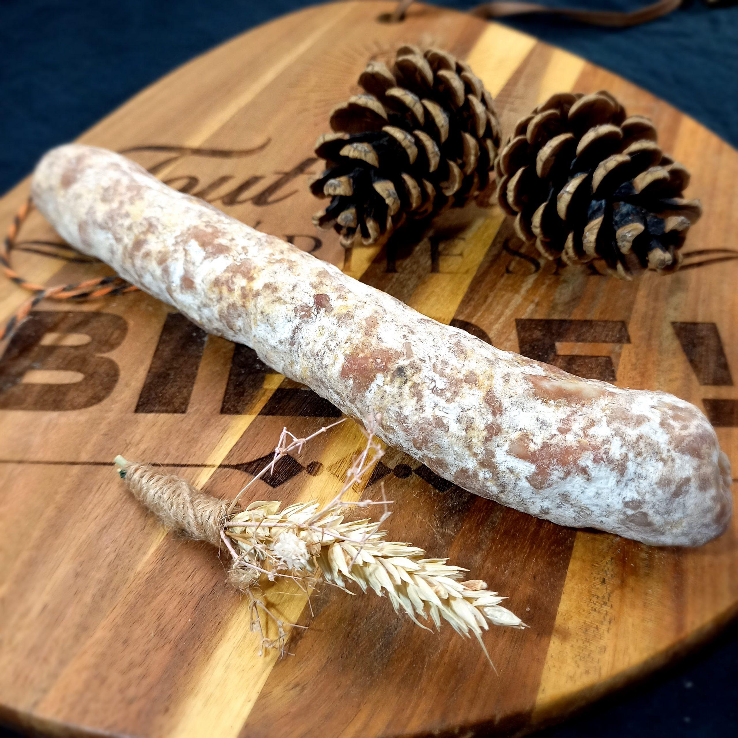 Un saucisson traditionnel, typique de l’Auvergne, préparé selon un savoir-faire artisanal.